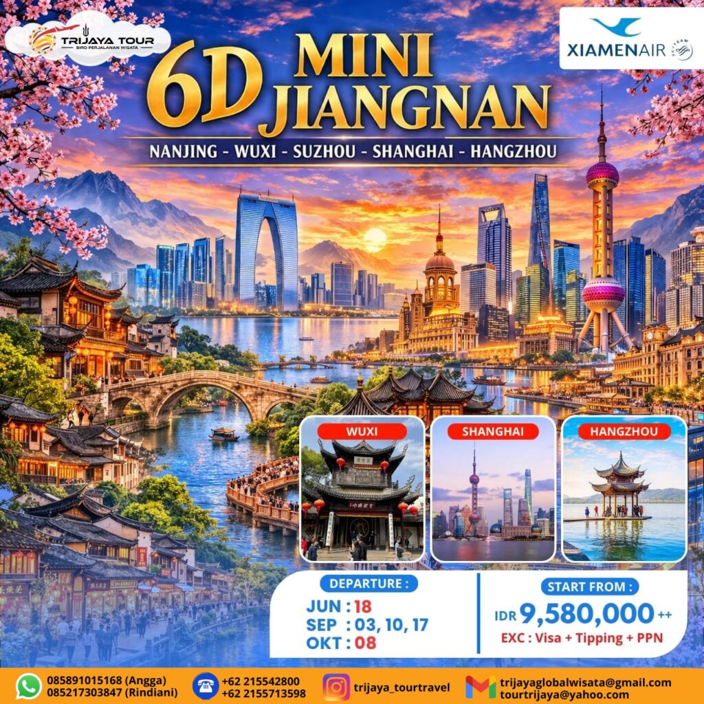 Setelah perjalanan budaya yang memperkaya ini, kita akan dipindahkan dengan nyaman menggunakan kendaraan pribadi ke Suzhou, yang dijuluki “Venice dari Timur,” di mana kanal kanal kuno bertemu dengan inovasi modern. Setibanya di sana, itinerary kita dilanjutkan ke Danau Jinji (Jinji Lake) yang menakjubkan, sebuah oasis perkotaan yang berkilau, dikelilingi oleh pepohonan hijau dan landmark kontemporer. Di sini, Anda akan berhenti untuk mengagumi dari luar Gate of the Orient, sebuah gedung pencakar langit ikonik setinggi 301,8 meter dengan desain lengkung yang unik, menyerupai gerbang megah menuju masa depan. Berdiri di depan keajaiban arsitektur ini, Anda akan menyaksikan siluetnya yang menjulang tercermin di